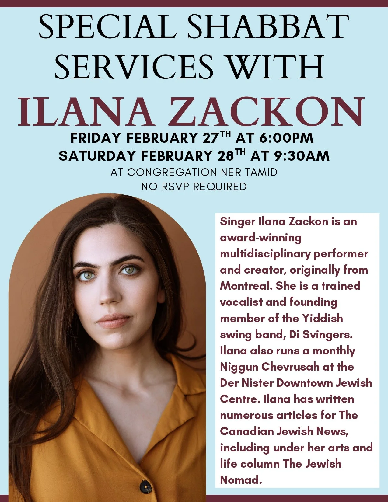 Ilana Zackon is one of the actors from the first Braid show and was at the performance at CTJ! Attend Congregation Ner Tamid’s special Shabbat services with Ilana. No RSVP needed.